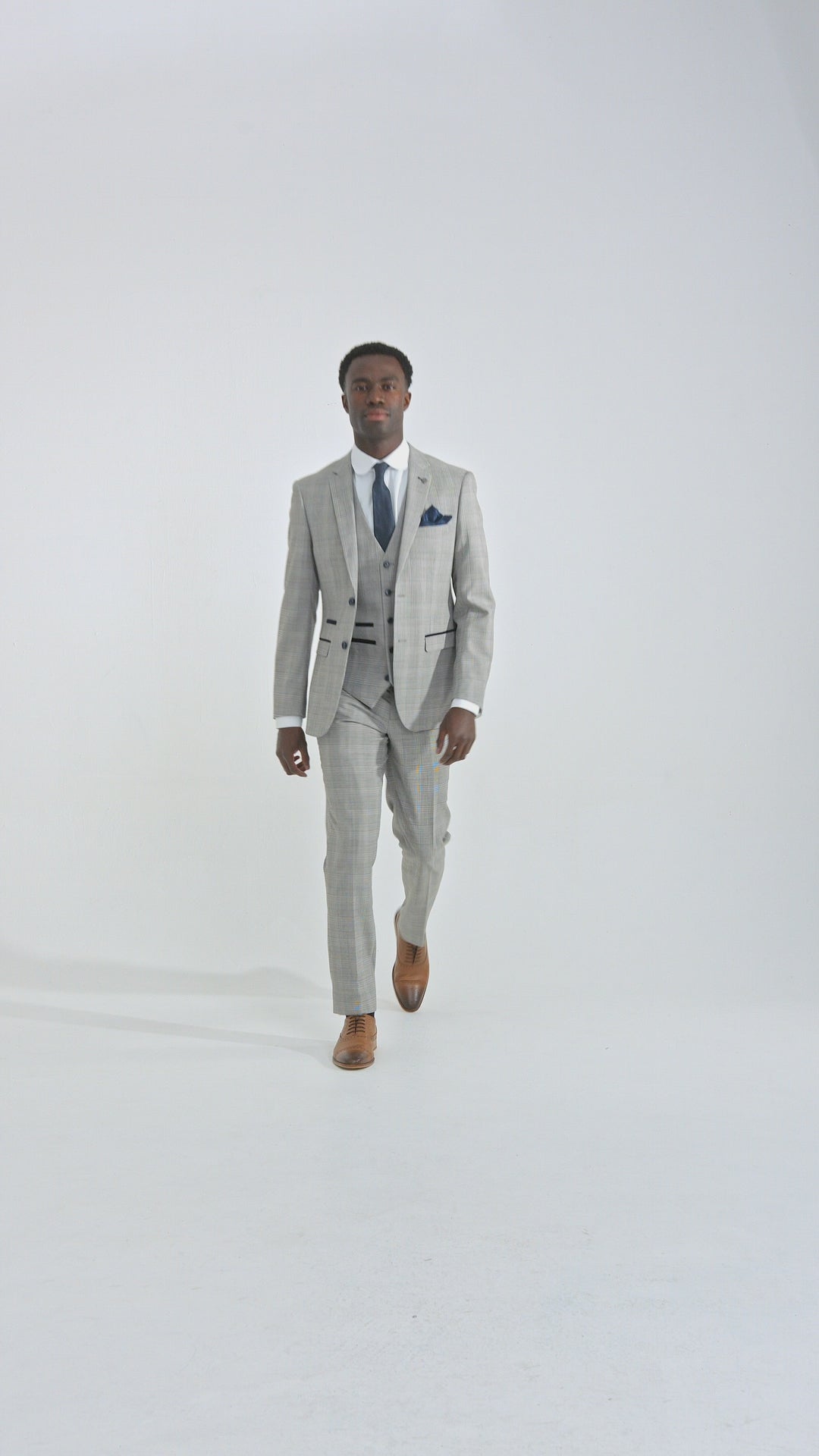 * Navy velvet trims: Adding a touch of elegance, the suit has navy velvet trims along the pockets providing a luxurious contrast to the grey fabric.
