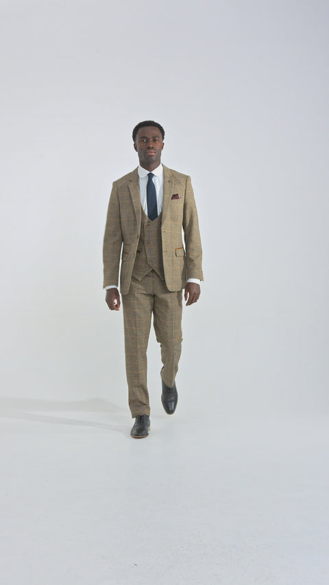 Mens 3 Piece Herringbone Tweed Tan Brown Check Suit Tailored Fit Double Classic