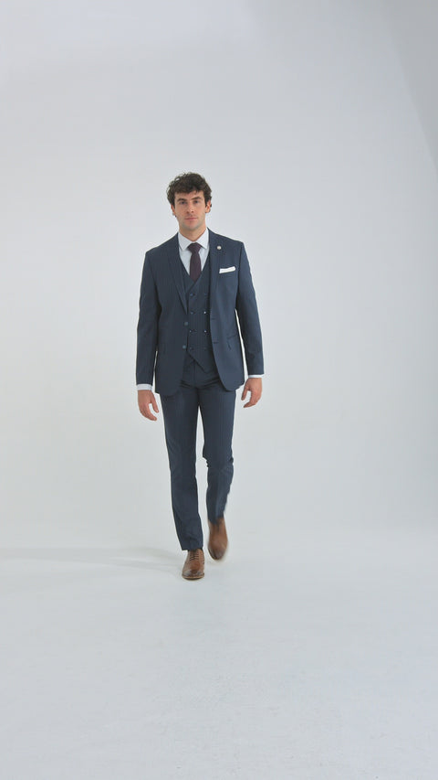 Mens 3 Piece Pinstripe Navy-Blue Suit