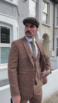 Men's 3 Piece Suit Wool Tweed Herringbone Tan Brown Blue Check 1920s Gatsby